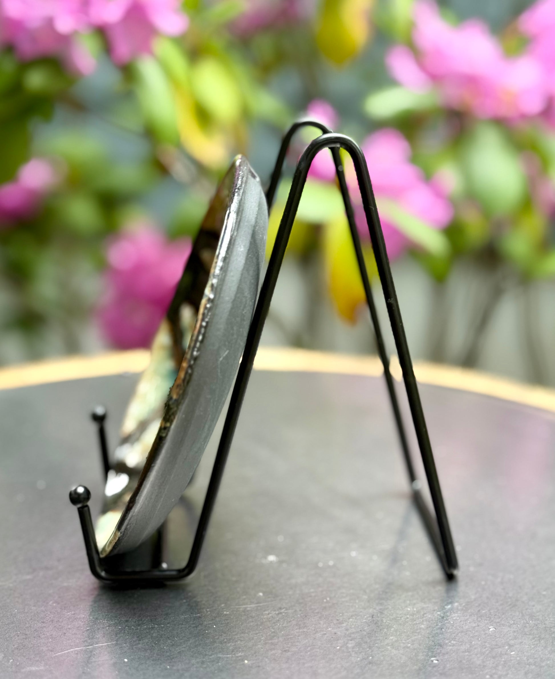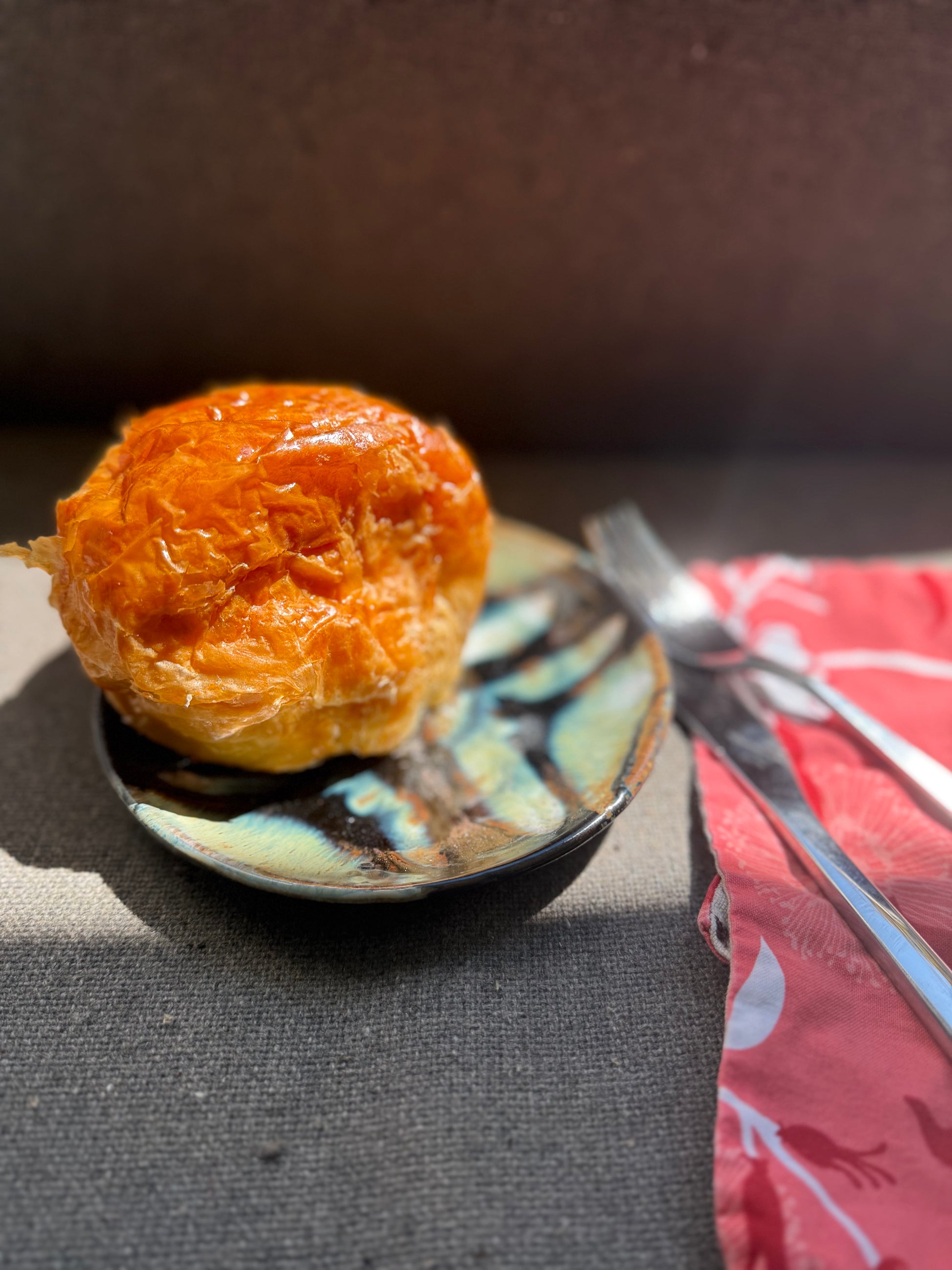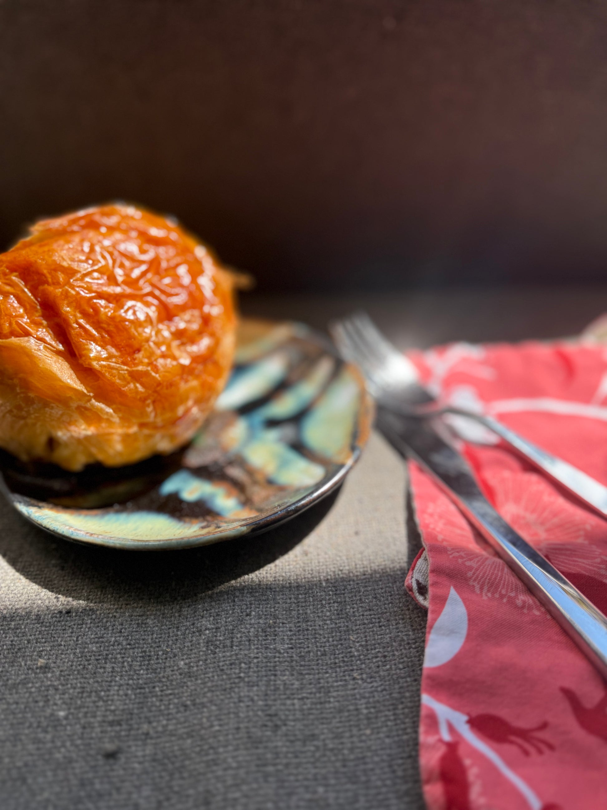 This ceramic dessert dish is functional art inspired by all the things we see when we’re trying to see an eclipse-the edges of special glasses (the pinhole camera is what I remember), the clouds and the sky and that sudden aha! I hope you find it at least as entertaining, and you can take it out to serve yourself a slide of pie or a big croissant any time of year—any year. Made with stoneware and glazed with a tape and brush technique, it crosses the art and science lines in the way we might all wish.