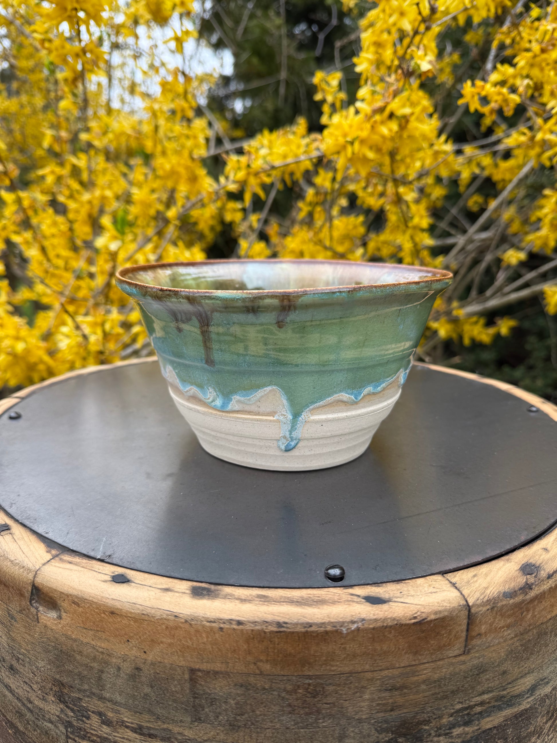 I threw this bowl on a day of quotidian frustration, but I was so satisfied with the process and adding ridges I felt much better when I was done. Then, after a bisque firing, I got to play with the best drippy glazes before the glaze firing—you never know who the colors will meld, or whether a drip with stick and ruin your piece. This one feels like luck.