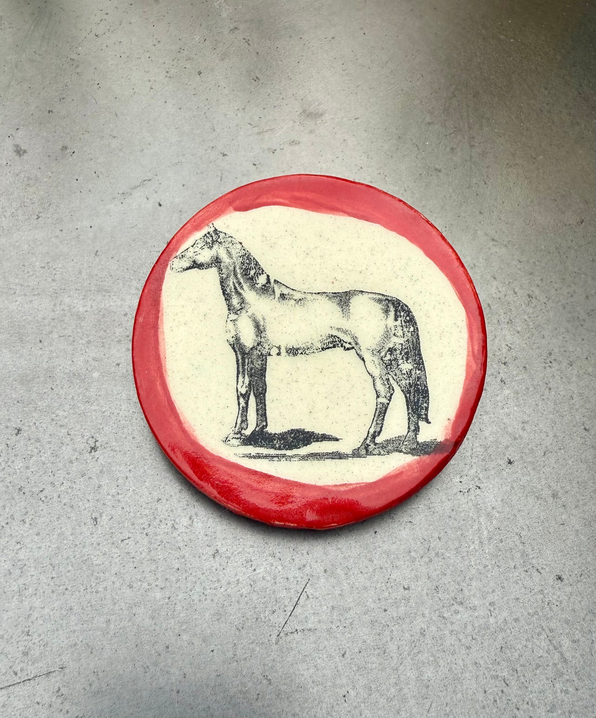 One of the first things I made in pottery was a horse pitcher. I will never stop loving them, even if I’m no longer riding. Underglaze transfers, texture and underglazes as well as overglazes went into this process. These little coasters measure 3 inches in circumference. Set of two, with felt pads on the undersides.