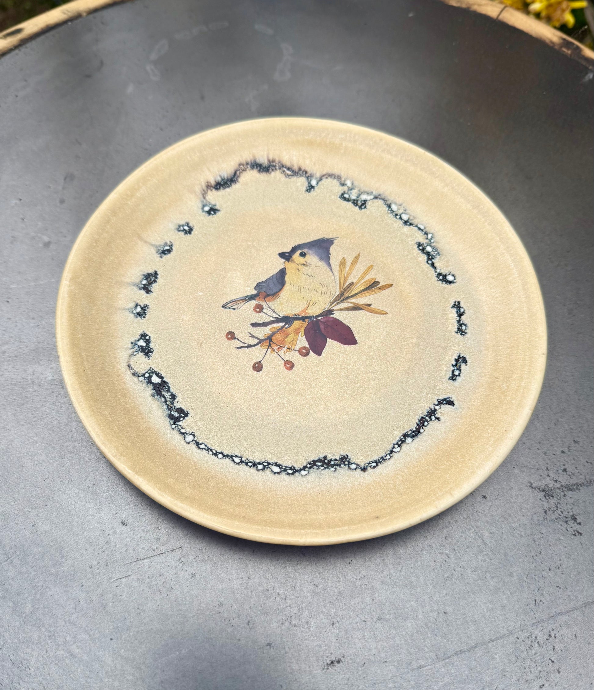 Another birch glaze combination rendered the perfect organic frame for this underglaze transfer of a tufted titmouse, the ghibli character of the backyard. Maybe for a child, or a grown up who still holds childlike joy.