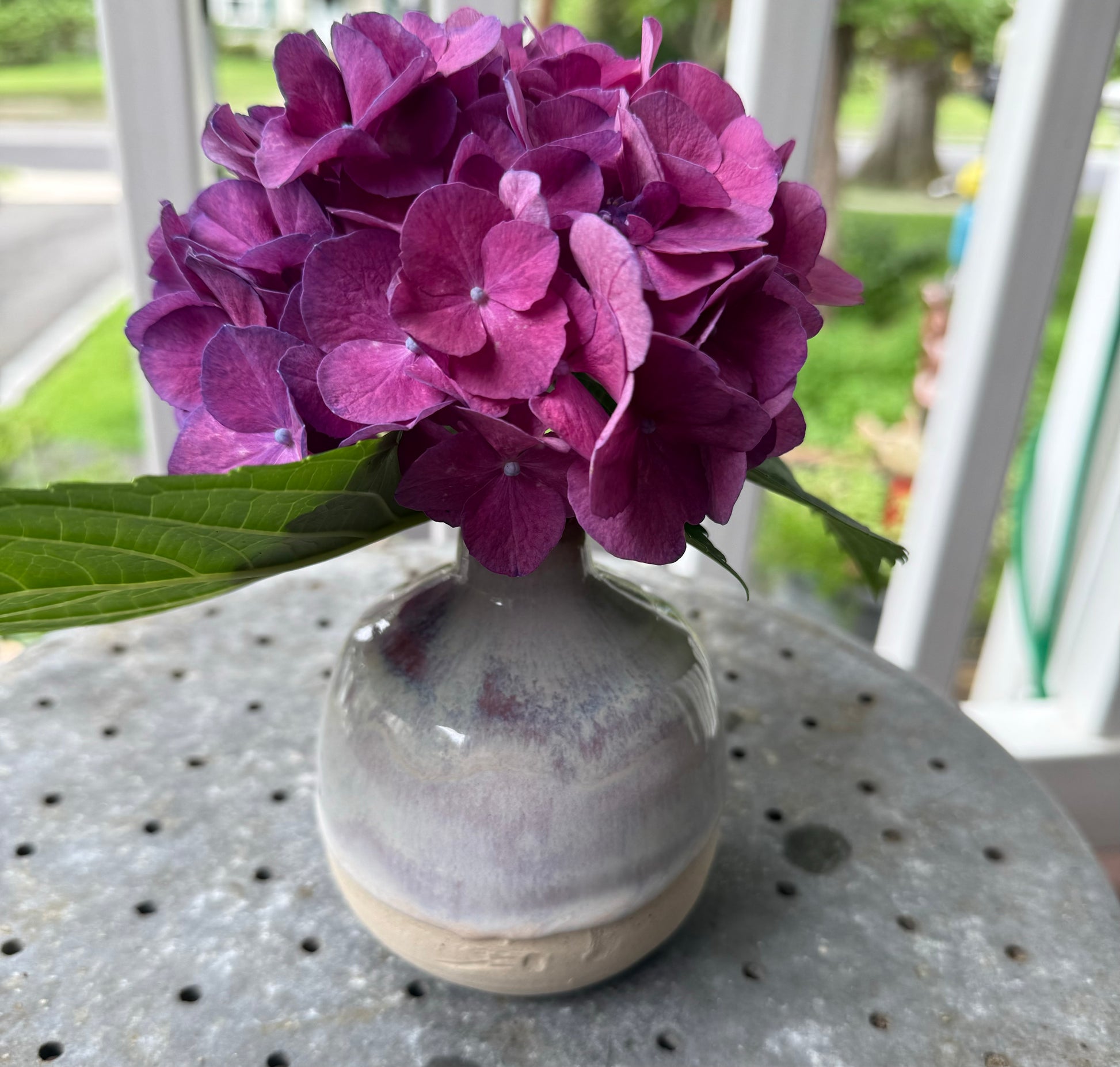 This wee bottle vase is perfect for your first flowers—snowdrops, or wait for the yellow exclamation of forsythias. With the delicate pinks induced by honey flux vase and a naked bottom, you can see how glaze becomes glass at the edge. I always test my bottles to see what note they make when I blow across the top. I believed it was a b. Stoneware.