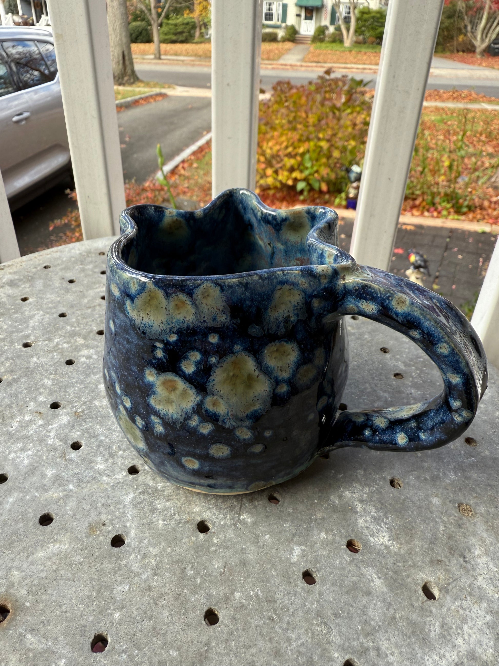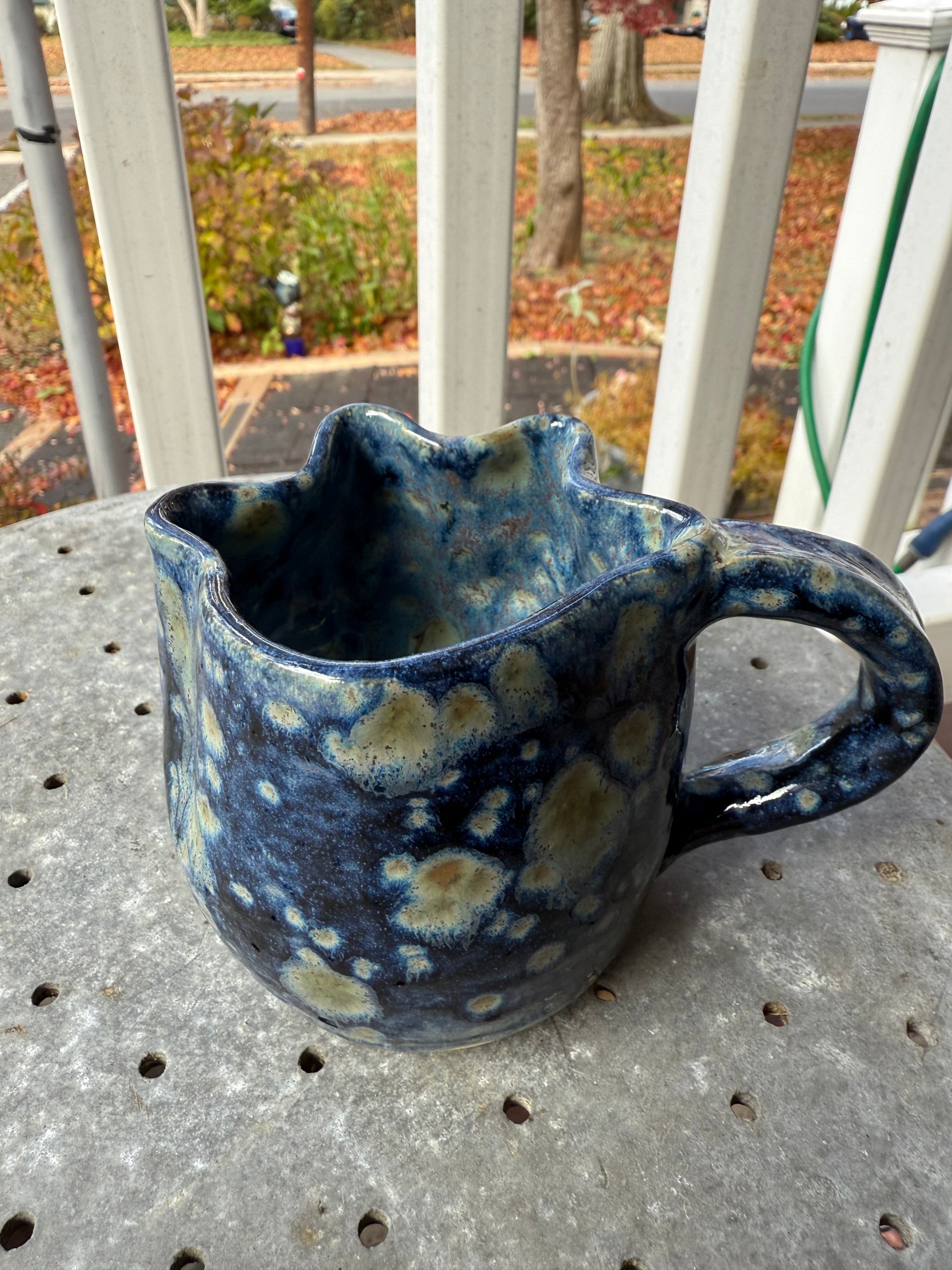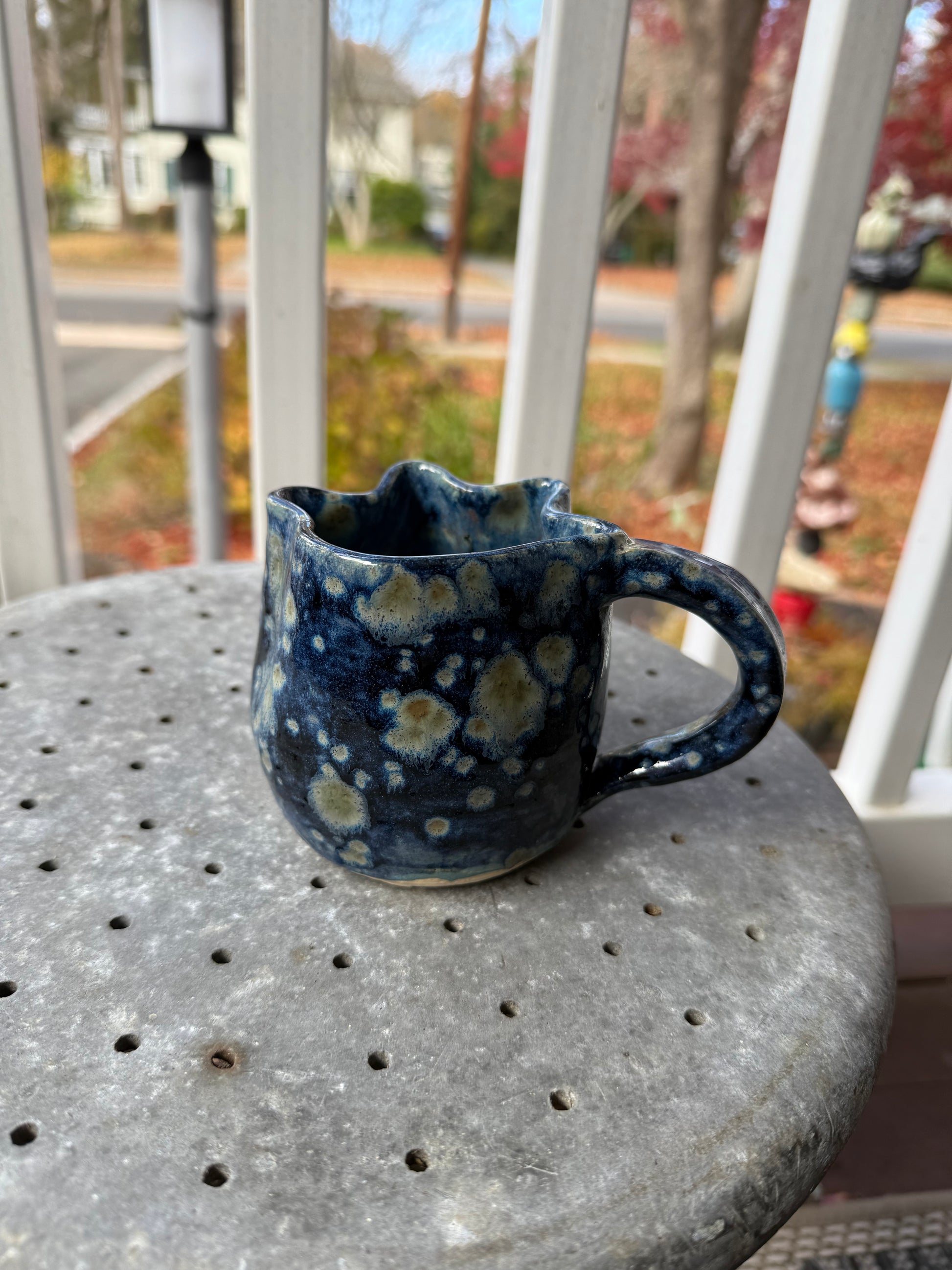 With a Van Gogh inspired glaze and unique pleating, this mug is one of a kind. Made for right handed beverage sippers, it hold 11 ounces, and stands 3 1/2 inches tall. Approximately 5 inches across at handle and 3 inches across the other way. The stoneware clay is wheel thrown, then altered with pleats and a pulled handle.