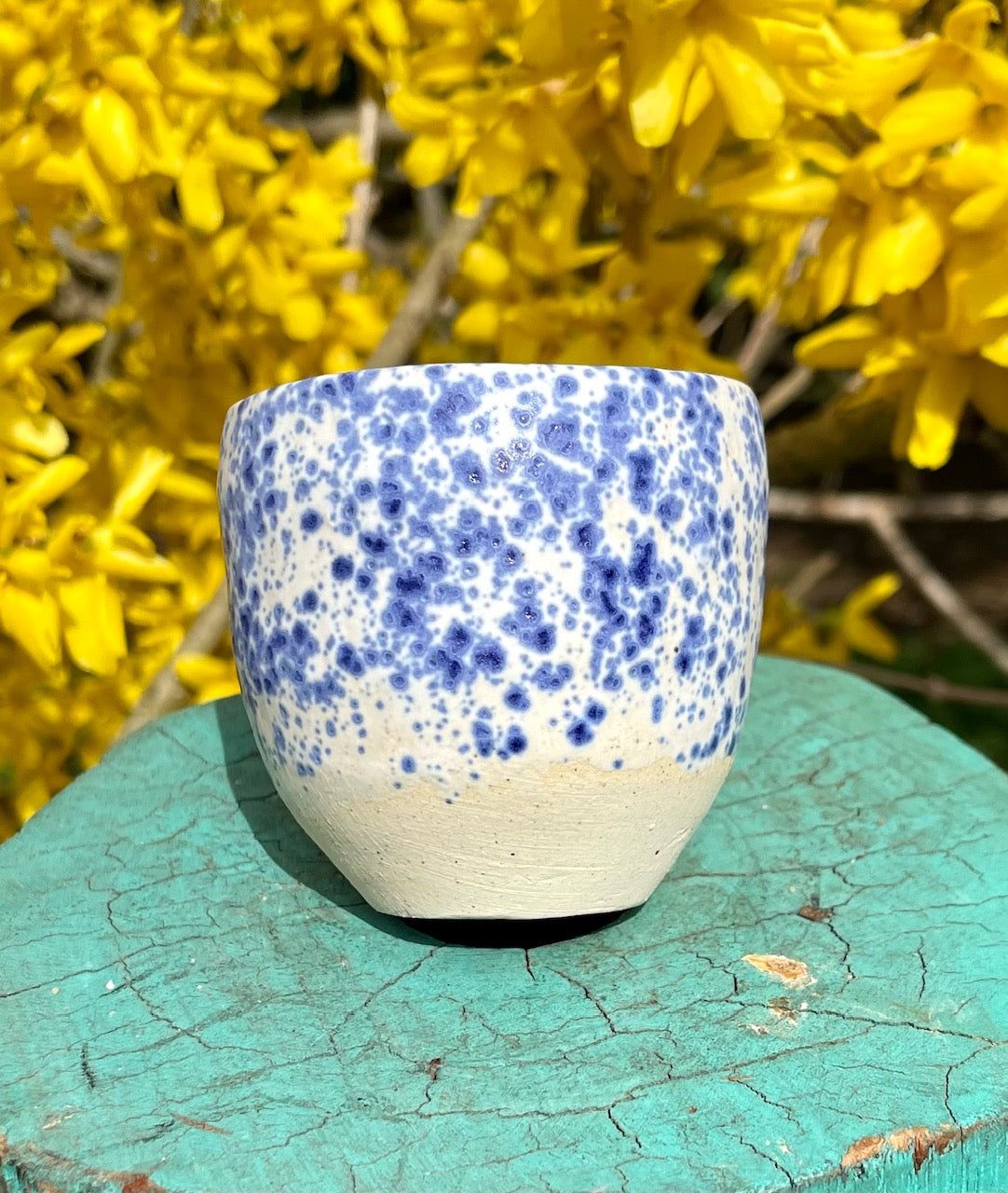 Thrown off the hump, maybe this blue and white speckled sweetheart is meant for milk and cookies; maybe it’s your new shot glass. This glaze and this size both make me sing happy little songs.